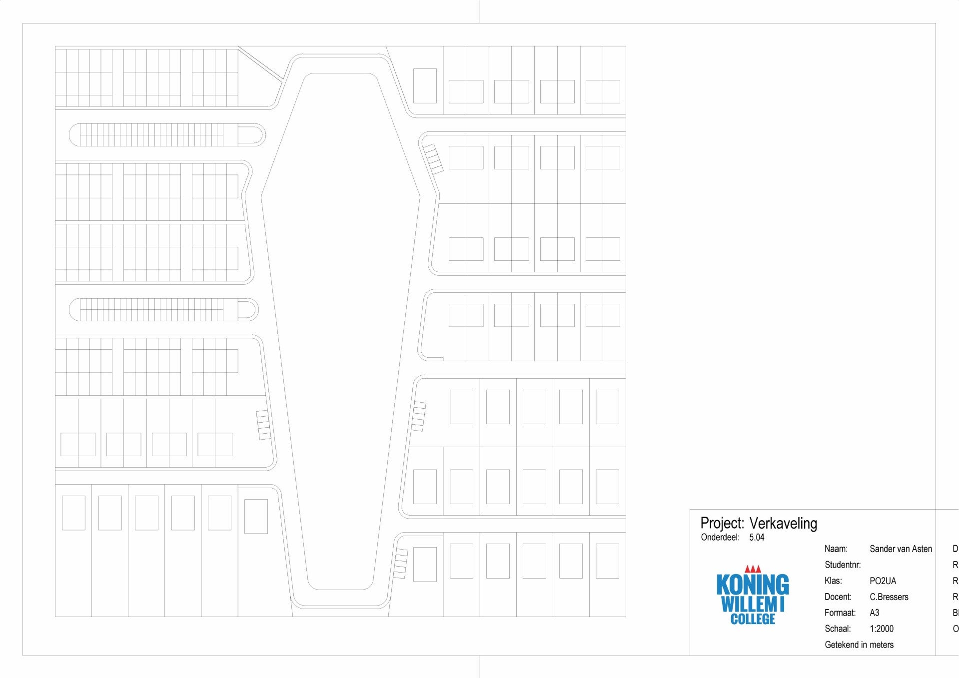 Voor het plangebied heb ik de verkaveling eerst geschetst en daarna heb ik deze in AutoCAD gedigitaliseerd. Ik heb ervoor gekozen aan de oostkant meer dicht bebouwde en grotere woningen geplaatst zodat er een betere overloop is van het centrum van de grote wielen met in het midden van het plangebied een parkje en aan de oostkant wat kleinere en minder dicht bebouwden woningen. Aan de zuidkant van het plangebied licht een groot stuk water waarvoor ik grotere woningen en grotere percelen heb geplaatst. Deze AutoCAD tekening heb ik ook nog mooi opgemaakt in Illustrator om deze presenteerbaar te maken.